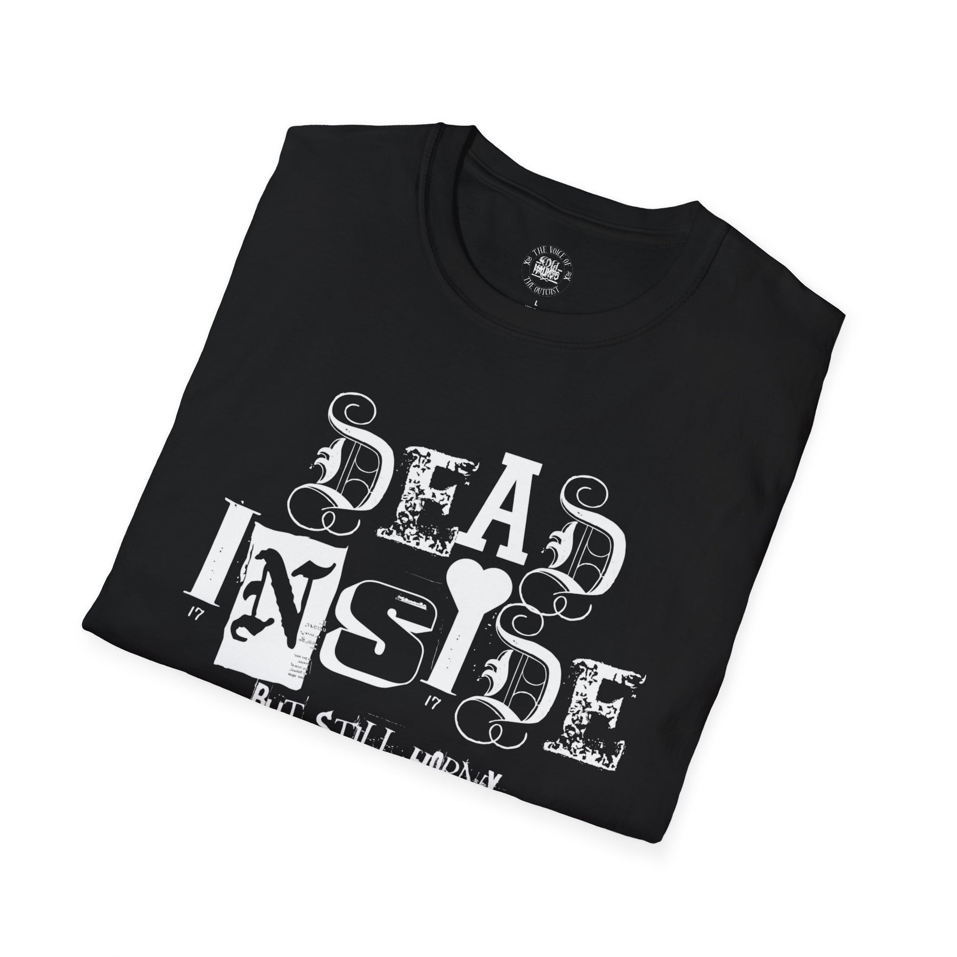 This black crewneck tee carries a dark-humored, gothic-punk attitude — bold white lettering and hand-drawn elements read like a sketchbook of midnight thoughts.